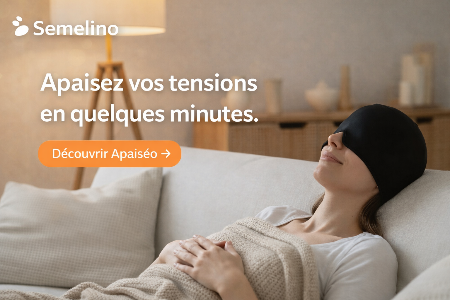 Semelino conçoit des solutions de bien-être simples et efficaces. Apaiséo, notre bonnet gel 360°, apaise vos tensions par le froid en quelques minutes — sans médicament.